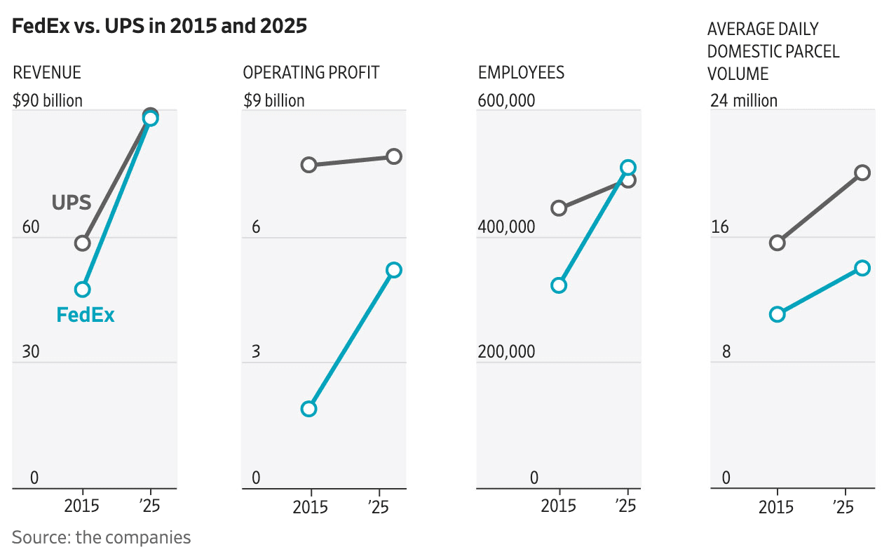 Volume isn't the only thing shifting. The WSJ reports that FedEx has officially overtaken UPS in global delivery revenue. This changing of the guard perfectly coincided with FedEx's Q3 earnings report last week, where the company showcased massive margin improvements driven by its aggressive "Network 2.0" cost-cutting and consolidation strategy. While UPS continues to navigate the hangover of its new Teamster contract, FedEx is leaning out its operations and reaping the financial rewards. Source: WSJ